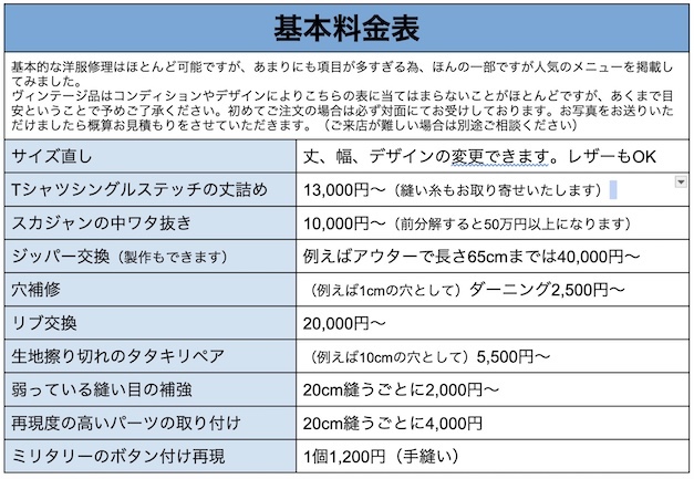 〜〜メニューが大変多いため、ほんの一部ですが”人気のお直し”を少しだけご紹介いたします。〜〜 ・じっくりとご相談させていただくため、アポイント制となっております。(出張もいたします) ・洋服のデザインや仕立て方、古着のコンディションによっては料金が全く違ってしまう事もございますので、お見積もりは直接お問い合わせください。 ・特にご指定のない場合は、元々のデザインに従い出来上がります。 ・ご注文の際に作業のすべてが決定いたしますので、特別なコダワリやご指定などございましたら事前にお申しつけ下さい。 ・基本的に残布はお返ししておりませんが、御入り用の方は事前にお伝え下さい。 ・”クリーニング表示ラベル”は、作業工程によりやむを得なく移動する場合、その移動料は無料です。ブランドネームタグの移動は有料です。 (家庭用品品質表示法に配慮しております) ・手作業につき、仕上がりまで大変お待ちいただく事もありますので、ご理解のほどよろしくお願いいたします。 ・長期のお預かりがご心配の際は、ご精算後にお手元で保管&ご使用していただけます。作業の順番が近づいた頃に再度お持ち込みor発送ください。 ・特殊な場合を除いて、出来上がり後の無料やり直しは致しかねます。無料の仮合わせもご利用ください。 ・出来る限りお客さまのご希望に添えるよう、ご注文事にはじっくりとご相談をする姿勢を取っております。 お客さまも、お時間に余裕を持ってご来店いただく事をおすすめいたします。 ・出来上がり後のクレームにつきましては、当方の事故以外は補償いたしかねますのでご了承下さい。 ・仕上がり日から1年以内にお引き取りをお願いいたします。1年以上の保管は致しかねます。やむを得ない事情で長期間の保管をご希望の場合は予めご相談ください。 ・よくある質問集もご覧下さい。 ![]() ※皆様のご要望にできるだけお応えできるよう、今後も常に新しいサービスと技術に挑戦し続け、予告なく料金を変更することがございます※ ※今まではその場ですぐに金額をお知らせしてしておりましたが、今後は少しお時間をいただいて細かく計算してから料金をご案内させていただくことにいたしました。 |