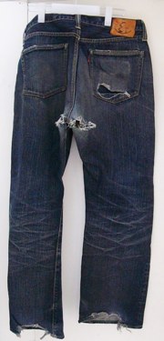 | ●BEFORE● 今回のこのジーンズは、 友人に協力してもらいました。 かなりひどいダメージです。。。 診断してみますと、 1.両足のスソの擦り切れ。 2.お尻の部分がボロボロ。 3.右後ろのポケットに、 ぽっかりと穴が。 色は濃い目で、ヒゲも美しく、 穴さえなければ まだずっと履きたいですね。 でも、どうしてこんなに破れて しまったの?? 自転車に乗っているうちに お尻とスソが こんなにスレてしまったそうです。 ポケットは、お財布のせいですね。 では、この元の色を保ちつつ、 リペアの開始をいたしましょう! |