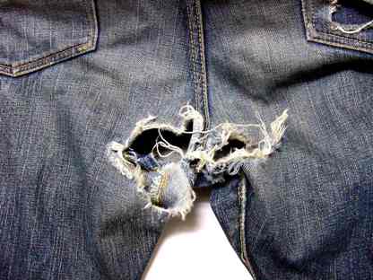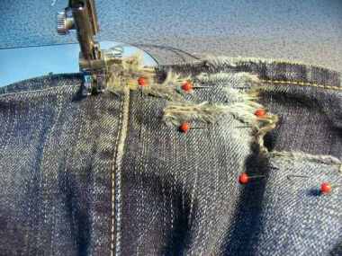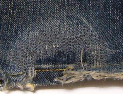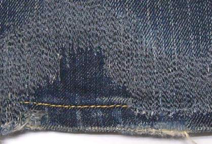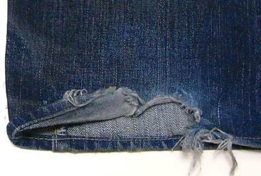 1:ではまず、スソから直していこうと思います。 これは、左足のスソです。 みごとに擦り切れてしまっています。 |