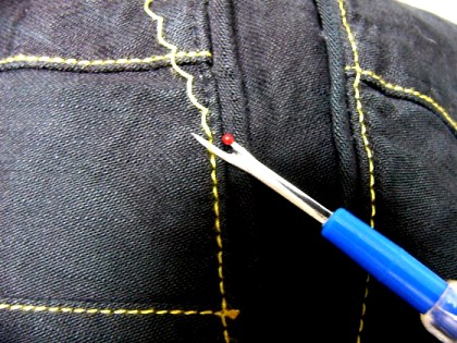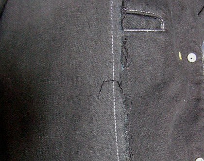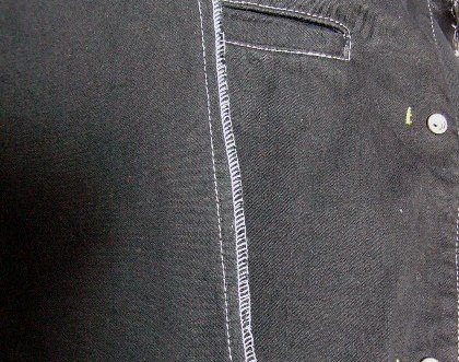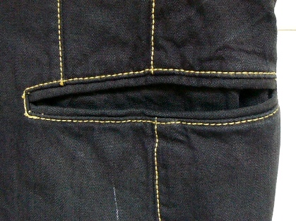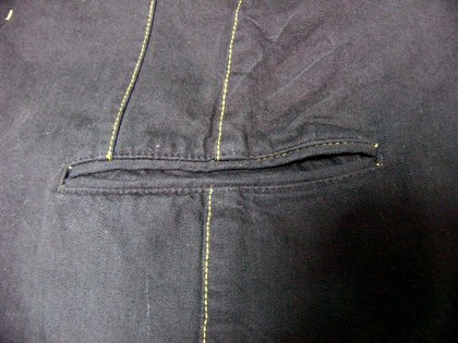 1:わかりやすいところで、脇ポケットから見てみましょう。 このポケットの名称は、「両玉縁(たまぶち)ボケット」といいます。 ウエストシェイプのためのステッチを、 ばっさり横切っています。 |