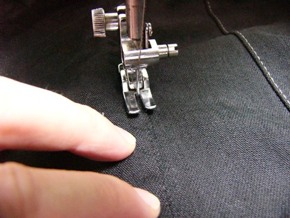 8:後染めなので、糸を抜いたところは跡が付いています。 そこを、寸分の狂いのないように、ずれないように、 新しい糸でミシンをかけていきます。 |