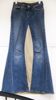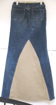 こちらはユニークですね! ジーンズそのもの、 マキシ・ロング・スカートになりました。 私の写真の撮り方が悪いですね(汗)、 背景を考えればよかった。 お客様のお好みの生地をはさみました。 |
