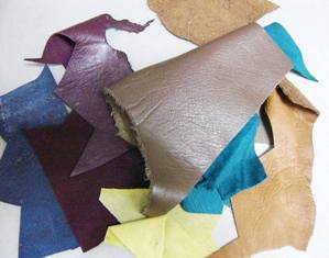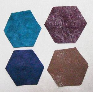 ②今回は、革のはぎれ6色を使って・・・ とご指示がありましたので、使えそうな部分を選びます。 表を使えば革、 裏を使えばスエードです。 |