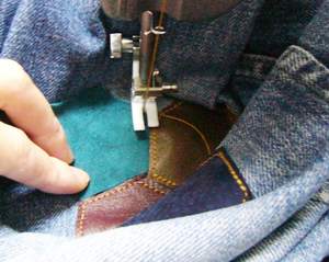 ④ステッチの色を、目立つゴールドにして、 ジーンズに縫いつけていきます。 モモやヒザは、とても縫いにくい場所です。 |